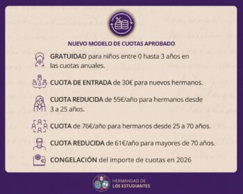 El cuarto y quinto punto del orden del día se refería a las propuestas de la Junta de Gobierno sobre un nuevo sistema de cuotas, que fue aprobado por la totalidad de los asistentes. En el cuarto punto se acordó la propuesta de no aplicación excepcional de la actualización automática de las cuotas ordinarias conforme al IPC para el ejercicio 2026, previa correspondiente dispensa de la autoridad eclesiástica competente al referido punto de las Reglas. En el quinto punto se aprobó, tras su debate correspondiente, la implantación del nuevo sistema de cuotas y exenciones para los hermanos, que entrará en vigor a partir del segundo semestre del ejercicio 2026. En el mismo se establece una cuota de entrada para hermanos nuevos de 30 euros. Los hermanos de 0 a 3 años quedarán exentos del abono de la cuota limosna. Los hermanos de 3 a 25 años tendrán una cuota reducida de 55 euros al año. Para los hermanos de 25 a 70 años la cuota anual queda en 76 euros y los hermanos mayores de 70 años tendrán una bonificación del 20% quedando su cuota limosna anual en 61 euros. Estas cuantías serán ya efectivas desde el segundo semestre de 2026.