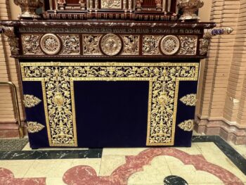 Por último, y mirando hacia el futuro de la Hermandad, se exhibe en la muestra el frente completo del nuevo “paso” para el Santísimo Cristo que, en un trabajo multidisciplinar, avanza en su terminación completa. Con este frontal del “paso”, el visitante ya podrá tomar idea de lo que va a suponer su ejecución. Desde la idea y dibujos originales de Antonio Gutiérrez de la Peña, enriquecidos y adaptados para su realización por José Manuel Ramos, en la ejecución de la obra han intervenido el taller de carpintería de Oscar Caballero, y el taller de los hermanos Ramos para la orfebrería, con tallas en el respiradero de Miguel Ángel Domínguez y en el canasto de Manuel Téllez. La cartela central de la Anunciación, así como el resto de cartelas que ocupan cada una de las capillas de los laterales y trasera del “paso”, son obra del profesor titular del Departamento de Escultura de la Facultad de Bellas Artes, Guillermo Martínez Salazar.