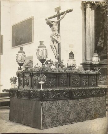 En aquella primera salida, cuatro grandes faroles alumbraban al Crucificado de la Universidad, al que todas las crónicas de la época se referían por entonces como «una de las creaciones más perfectas del inmortal Martínez Montañés». Cuatro copas de plata, adornadas con flores, enriquecían las esquinas del canasto, sumándose una más a los pies del Cristo. Completaba el sobrio y esmerado conjunto unos faldones de damasco en color morado.