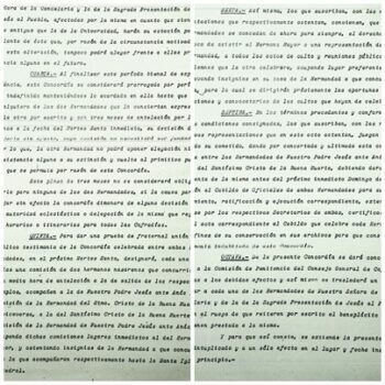 El texto de la Concordia permitía la permuta de las dos cofradías en los puestos tercero y sexto que ocupaban en la nómina del Martes Santo de entonces, por un plazo de dos años -1971 y 1972-, entendiéndose no obstante indefinida, una vez finalizado el plazo, hasta que la misma fuera anulada por cualquiera de las dos hermandades y sin que implicara dejación de los derechos históricos de ambas; contenía también unas disposiciones formales como el envío de una comisión de nazarenos para ser representada en la cofradía contraria en las estaciones de penitencia de ambas, e igualmente la asistencia representativa a los actos de culto y reuniones públicas de cada una de las hermandades, con la obligación finalmente de dar cuenta del acuerdo a los Cabildos de oficiales respectivos, al Consejo General de Hermandades y Cofradías para su conocimiento, y a las hermandades de San Benito y la Candelaria, afectadas por el cambio de orden.