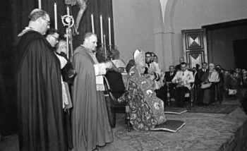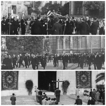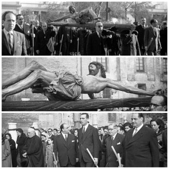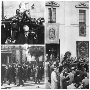 Traslado del Stmo. Cristo, atravesando la plaza de la Encarnación, con el Ministro de Educación Sr. Ruiz Jiménez y a su izquierda el Rector Sr. García Oviedo.