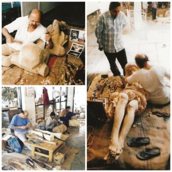 En el taller de los hermanos Sikuera, un hombre de edad madura y mirada intensa mete su gubia con seguridad en el acabado de unos dedos. Ante él, dos brazos totalmente formados a falta de marcarles dedos y tendones. Son los brazos del “gemelo” indio de Nuestro Cristo que está naciendo allí; la estampa de este imaginero, volcando su cuerpo y mente en la obra, hace volar la imaginación hacia otra escena, quizás no muy distinta, que tendría lugar en 1620, en un taller a 10.000 kilómetros de distancia de Uasai. El tiempo y la distancia no son obstáculos para que el Santísimo Cristo de la Buena Muerte lleve su protección y consuelo a tantos fieles indios que están deseando tenerlo cerca para postrarse a sus pies…”.