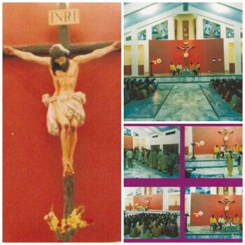 La Hermandad va a hacerse cargo además de sufragar el coste de ejecución de un Crucificado, réplica del Santísimo Cristo de la Buena Muerte, para lo que se contrata con un artista de la zona al que se le envían fotografías del Sagrado Titular de la Hermandad. El gran impulsor de este proyecto, el hermano de la Corporación D. Fernando Ron, escribiría un bello relato sobre la construcción de la Iglesia que no queremos dejar de extractar: